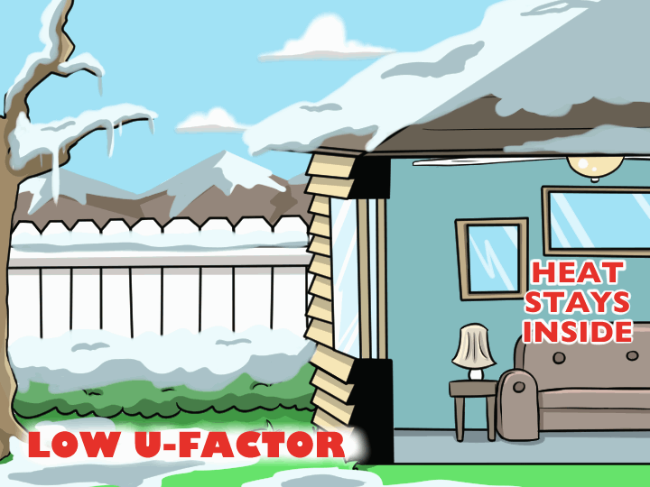 The U-factor measures how much heat a window allows outside of a home. If you live in a northern state like Illinois or Minnesota, you want a low U factor which means you want to minimize the amount of heat a window releases from inside to outside.